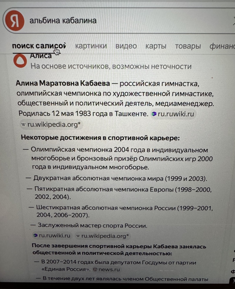 мы тут немножко смотрели *звезды в джунглях) и там была девушка с интересным ФИО) альбина кабалина. кто такая думаем) спросили у Яндекса, а он вононочо) вопщем сами смотрите.