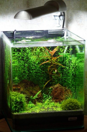 Не вариант есть такой светильничек у меня Jebo максимально он на 13 ватт. Родной у кубика вообще 11 ватт, но тем не менее посаженные пару веточек глоссостигмы растут (между камнями). Трех по 12 должно хватить, высота столба воды не больше 35 см получится у вас.