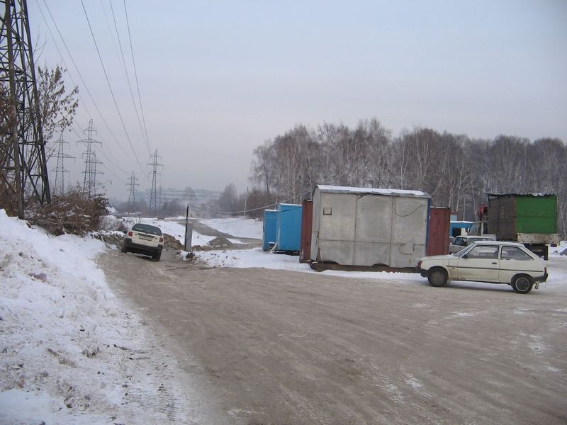НО! Камазисты проделали за вагончиками колею для себя и ею сейчас все пользуется, т.к. она подмерзла и легковушки могут по этому "зимнику" проехать. А т.к. этот "зимник" одноколейный, то из-за реверсивности движения образуются огромные пробки и мешают покупателям выехать с БМ.