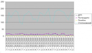 Хотя статистика это не очень подтверждает. Во всяком случае, за месяц. Смотри картинку. Видно только что по воскресеньям столкновений намного меньше.