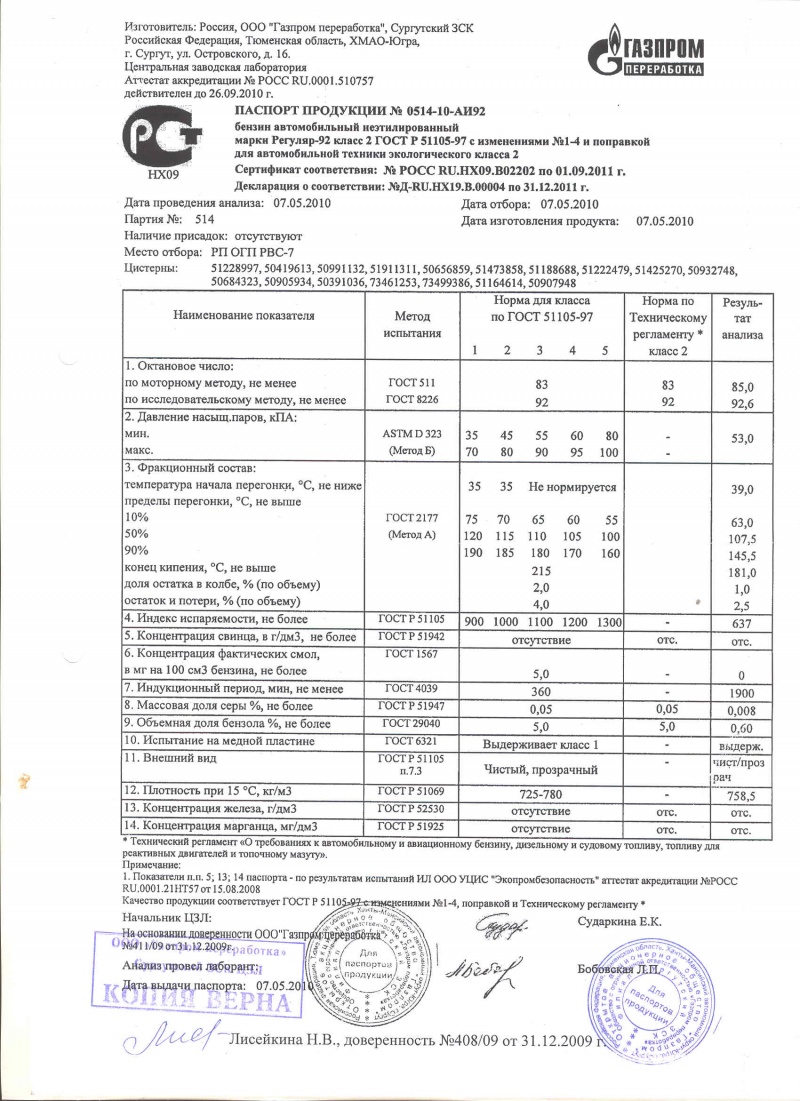 Напишите пожалуйста какой бензин у вас продается 92 или 93? И желательно также сертификат на него приложите. А то по разному написано, на стенде одно, в чеке другое.