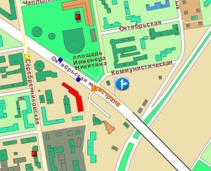 едем по улице Кирова от метро Октябрьская, перекресток - пересечение Октябрьская магистраль с Каменской или Коммунистической (нипанятно, но не важно).