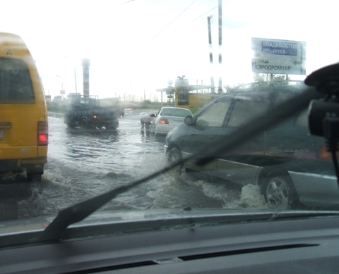 Нормальная ситуация. Сопки, дождик, вода стекает в низины и стоит. Я в Чите несколько раз попадал (там рельеф не равнина... но и не горки как во Владике) когда по улице течет поток глубиной несколько сантиметров а в низинке плещется море. ДЕтишки подрабатывали - машины за копеечку вставшие выталкивали.
