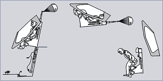 - взяться обеими руками за шторку, плотно закрыть рот и глаза, напрячь мышцы всего тела и энергично потянуть шторку вниз; при этом в первой половине хода шторки сбрасывается подвижная часть фонаря и выдергивается предохранитель стреляющего механизма катапультной установки, во второй половине хода шторки происходит катапультирование (выстрел).