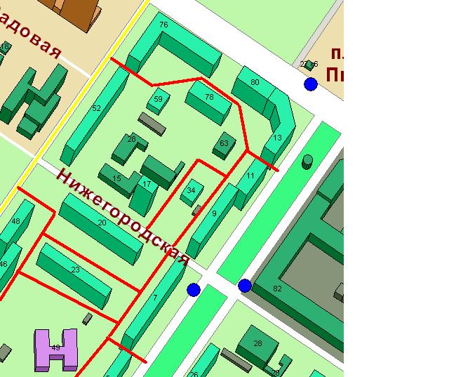 По ГОСТ на выездах с прилегающей территории на одностороннюю Нижегородскую должны быть знаки "Выезд на дорогу с односторонним движение". На схеме проезды обозначены красным.