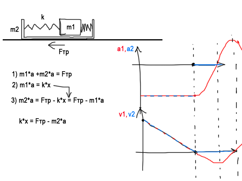 условие, напомню, такое. есть поддон массы m2, который скользит по столу, и тормозится из-за трения. пусть сила трения какая-то, Fтр (сила трения скольжения, разумеется). на поддоне массивный кирпич массы m1, он в поддоне бултыхается без трения, но растянут на пружинах, жёсткость которых (суммарная!) k. можем записать простые уравнения. все их будем записывать в лабсистеме. ещё один момент: начало нашей задачи - это установившееся торможение, процесс первого нажатия на тормоз и всякие колебания - отбросим, всё затухло.