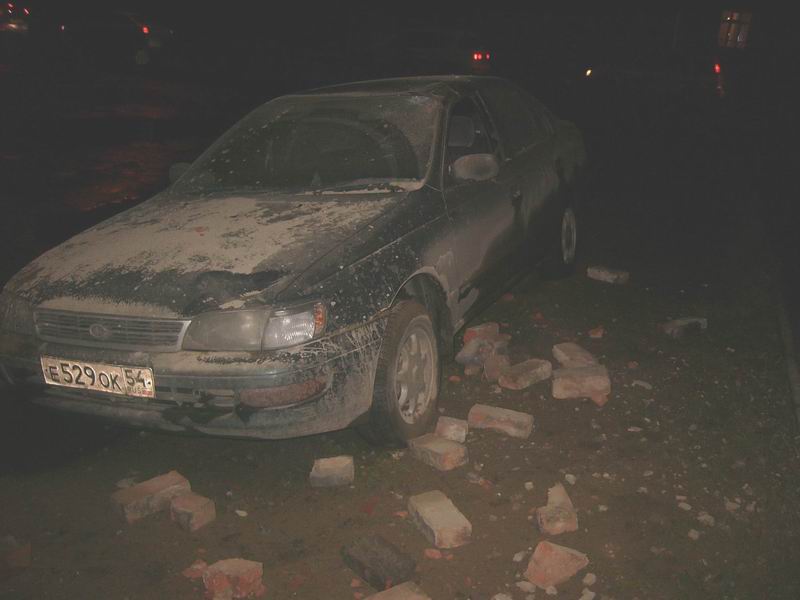 Вчера вечером на мою машину с крыши упала груда кирпичей, на крыше трехэтажного дома по ул Учительской №3, развалилась вентиляционная кирпичная труба и щедро осыпала мою машину своими остатками. Хорошо хоть сам успел отойти. Вызвали милицию, подал заявление, сфотографировал остатки автомобиля, записал 3 свидетелей. Расстояние от дома до авто было 3.6метра.