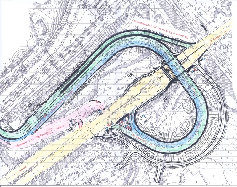 Сейчас за мостом через Иню справа идет подъем на эстакаду, которая тебя "уводит" поверху над БШ опять же под ж.д. мост на Первомайку.Это второй поворот направо от моста через иню. Первый на схеме не расцвечен.