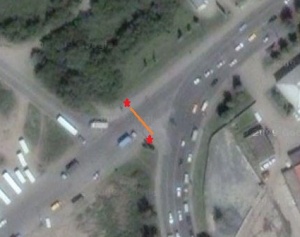 В нашем случае, мы едем по Троллейной, от Автокомбината. Сразу за остановкой "Бульвар Победы" светофор, регулирующий потоки по Троллейной прямо, и поворот налево на "Тещин язык". Его мы проезжаем на "зеленый". Проехали значит, и впереди видим еще один светофор - уже "красный". Таблички стоп и стоп-линии нет, и тут уже два варианта:
