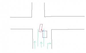 По факту, от лица стороннего наблюдателя, могло бы сложиться впечатление, что красная машина решила повернуть направо из среднего ряда, а синяя из правого поехала прямо и боднула в бок красную либо другая версия - красная ехала прямо, синяя решила, что ей тоже надо прямо и решила не пускать приближающуюся красную и втиснуться левее, но т.к. синий автомобиль стоял на светофоре, а красный ехал со скоростью 60км\ч, видя, что красный уже почти позеленел и пока автомобиль доедет до перекрестка - будет уже железно зеленый, ехал быстро...и пока синяя машинка растележивалась, красный почти миновал ее.