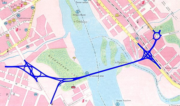 Вот ну в жизьни не поверю, что железнодорожный мост имеет по 6 (кажется) асфальтобетонных полос в каждую сторону и две развязки ...6 в каждую?