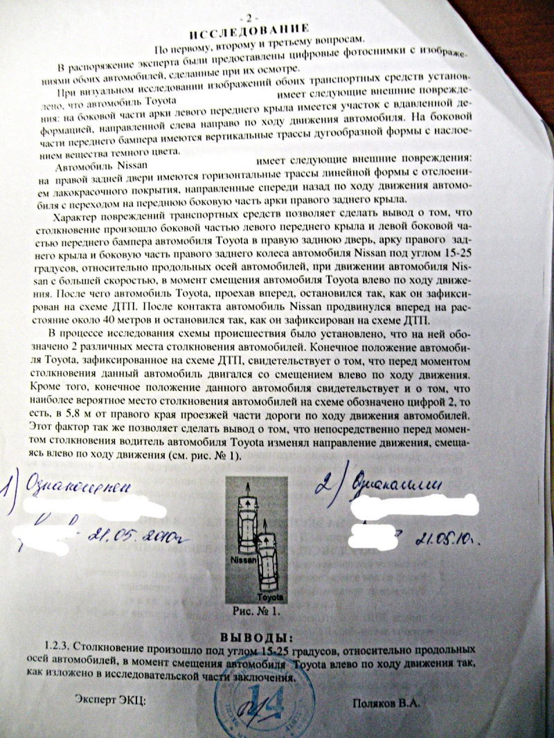 Что касается собственно заключения эксперта, то оно их серии "что вижу - о том и пою". Увидел на схеме эксперт то, что Тойота стоит чуть криво - значит, "Маневрировала!" - при этом про следы шин почему-то не упоминается (я про них еще раньше упоминал - почему их нет на схеме?). Увод с траектории мог возникнуть и из-за юза, неравномерности усилия тормозов, поэтому о том, насколько "ровно" ехала Тойота в момент ДТП, мы говорить не можем. Что касается Ниссана, то про него вообще говорить нечего - ни про траекторию, ни про точку контакта - водитель пишет, что вообще не почувствовала, хотя 15-25град в заднюю ось сложно не почувствовать - машина делает "переставку". Описанние повреждений каждой ТС тоже не дают ответа - кто кого шоркнул. Про разницу скоростей - тоже интересно - откуда это взято...