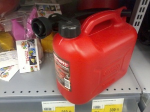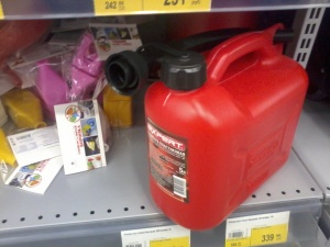 Покупал на Газпроме их официальную пластиковую (sic!) канистру. В неё и заправляю 92-й для бензогенератора. Нигде вопросов нет.