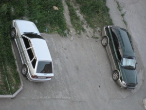 Ниже, кстати, пример.. Одна тачка моя, вторая - соседа. Мы оба выходим из авто сразу на тротуар, т.е. бордюр прямо у колес. При опеределенной сноровке на свободное место можно поставить еще 3 машины. Но, большинство соседей бросает их так, что только 4. А если приедет какая-нибудь блонди, то и всего 3...
