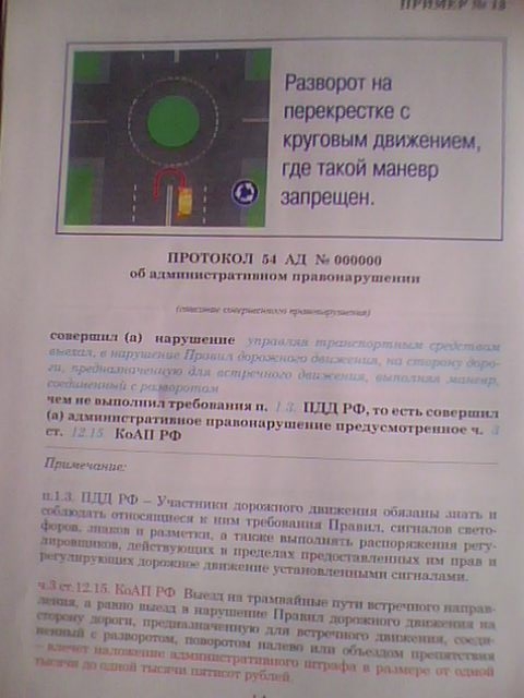 Фото не качественное, сори... Потому привожу текст протокола: "Управляя ТС выехал в нарушенииПДД на сторону дороги, предназначенную для встречного движения, выполнил маневр, связанный с разворотом, чем нарушил требования п 1.3."