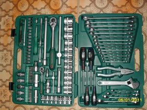 У меня большой набор - мелкие головки на 3\4, ключи от 8 до 24 и большие головки - от 12 до 32. Плюс пасатижи, молоток, тестер, биты.