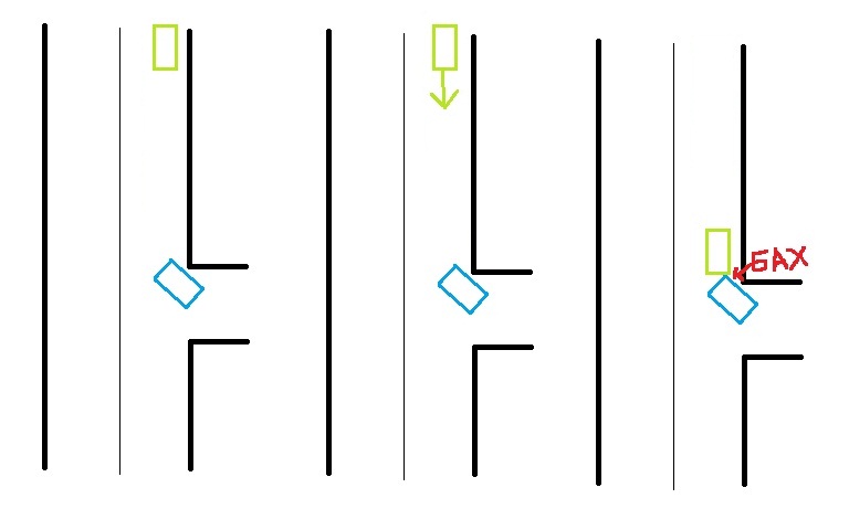 Достаточно дожаться когда едущий по главной отъедет от твоего автомобиля метров на несколько, так что бы когда ты всё таки выедешь на главную, а он решит ехать задом, то тебе уже ни кто не скажет что ты не пропустил, так как ты на полкорпуса успел вылезти на главную (как ты и рисуешь в своём примере). Ты сам уже на главной. И тут уже попал сдающий задом.