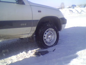 посетил, таки. На свою голову. После большого разворота, поворот на 90*. Разулась правая сторона. Сняло с дисков колесики, плотным снегом. Катались комрады на Шевроле Ниве. Помогли снова тапочки одеть
