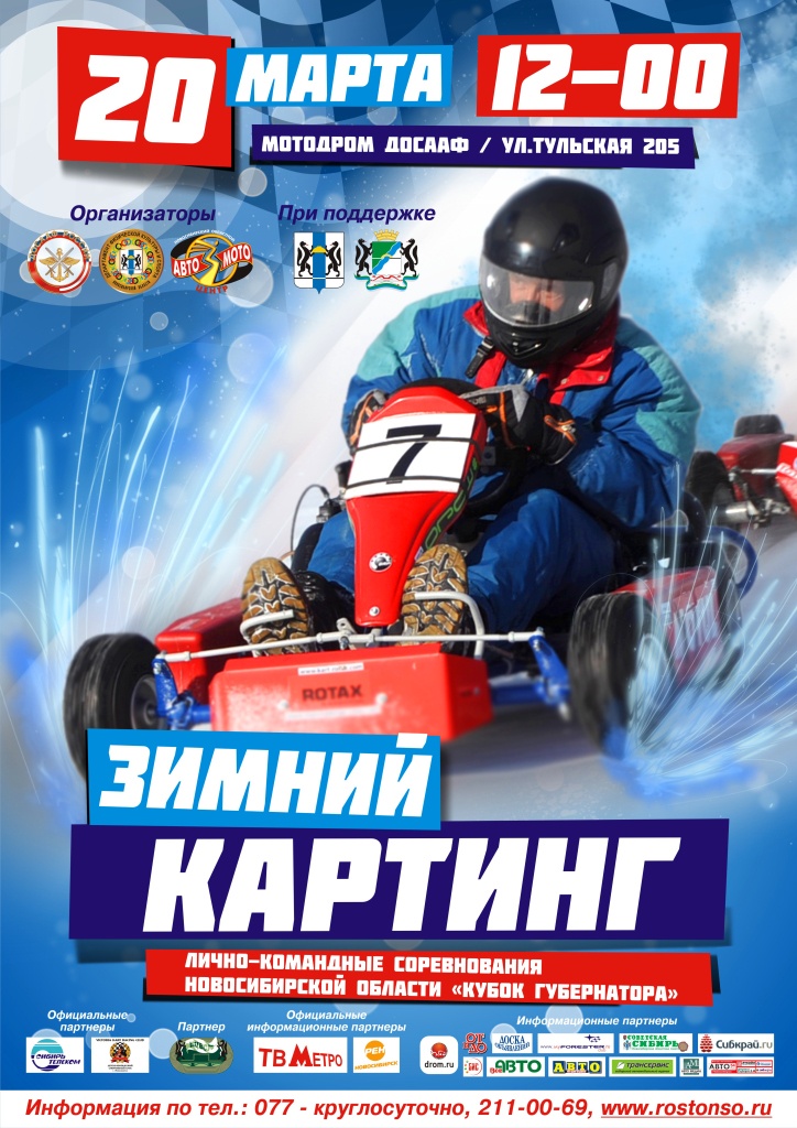 20 марта на мотодроме ДОСААФ по адресу: г.Новосибирск, ул.Тульская 205, пройдут открытые лично-командные соревнования «Кубок губернатора Новосибирской области» по зимнему картингу, организаторами которого выступят Новосибирское региональное отделение ДОСААФ России, ОЦД(Ю)ТТ «Автомотоцентр», Министерство образования, инновационной политики Новосибирской области и Департамент физической культуры и спорта Новосибирской области.