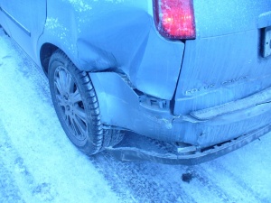 В стоячую машину. Не выбрав скоростной и режим и дистанциюУдар получен под углом. Вот и "дрифт"