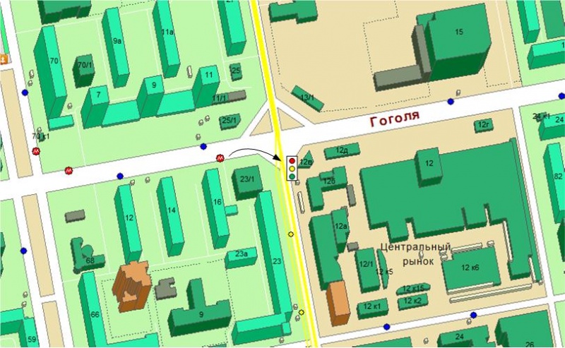 При повороте направо с Гоголя на Мичурина имеется светофор, обозначенный на схеме белым прямоугольником с тремя окружностями красного, желтого и зеленого цветов. Неоднократно на даннном светофоре наблюдал картину: на красный свет , кто-то останавливается, кто-то не снижая скорости проезжает. По логике, так-как отсутствует табличка "СТОП", надо бы проезжать и не останавливаться, но смущет факт более-менее значительного удаления светофора от перекрестка. Вот собственно вопрос, а как правильно ехать-то?