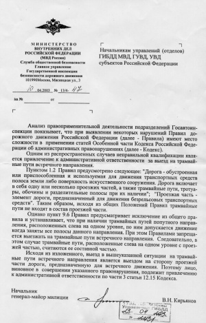Кроме того, предлагаю обратить внимание на дату приведенного Вами документа - это 2003г., когда в КоАП не было прямой, как сейчас в той же статье 12.15.3, формулировки наказания на запрет на выезд на ТП встречного направления, а было просто наказание за выезд на встречку, поэтому ГАИ и вынуждено было придумывать "костыли" в виде вот таких вот документов, чтобы административную практику единообразить и дать отмазку судам...