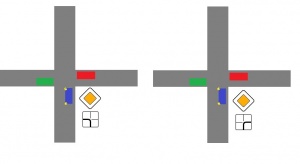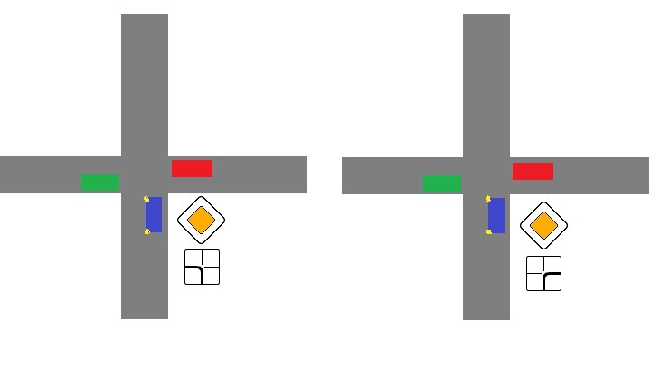 Знак STOP у нас в законе. Почему не применяется?А вот рассммотрим ситуацию. Синий, поворачивает налево. В первом случае он не уступает красному, во втором - уступает.