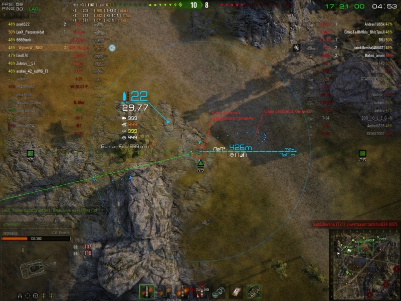 Третий скрин, объясняет, по крайней мере мне, почему я так точно на ИС-8 стреляю в движении (Скрин в движении по неровной местности). Площадь круга серверного прицела, в разы меньше площади круга прицела клиента.