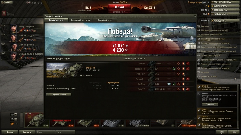 Хороший экипаж и средний за бой высок.