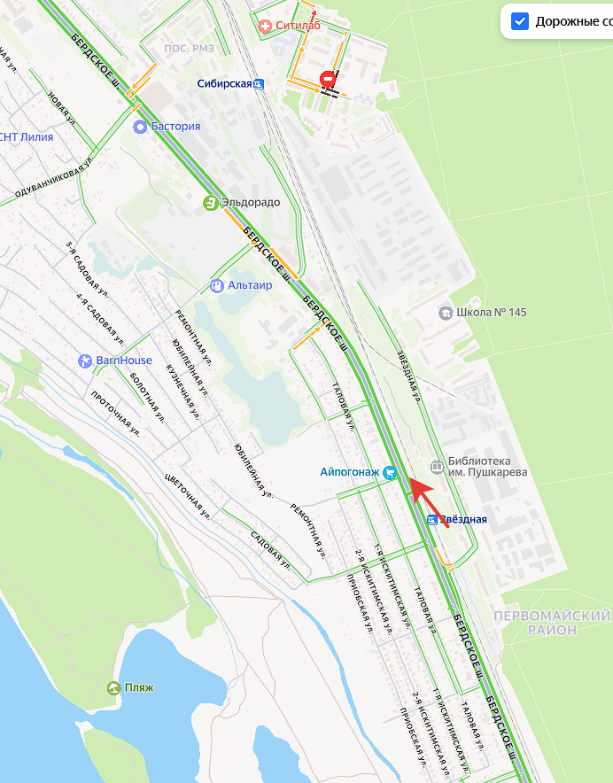На Бугринском заработал недавно. Если ехать с правого на левый.