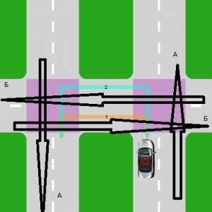 Разделительная полоса может быть шириной несколько сантиметров (в этом случае она чаще всего выделяется разметкой), а может быть и несколько десятков метров.Значит, пофиг на аллею. Вы разворачиваетесь на Большевистской, а с какой-нить заправки выезжает таксист и таранит вас в точке "1". Он, разумеется, будет прав, т.к. достиг вас на разделительной, где находятся его законные сантиметры