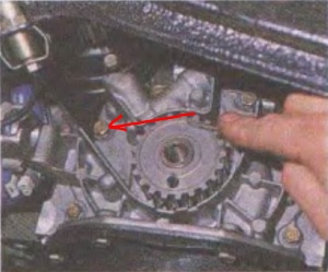 Ремень, хоть и идет почти ровно по шкиву распредвала, но со шкива коленвала съезжает внутрь, к блоку. А там его поджидает болт, которым прикручен маслонасос.