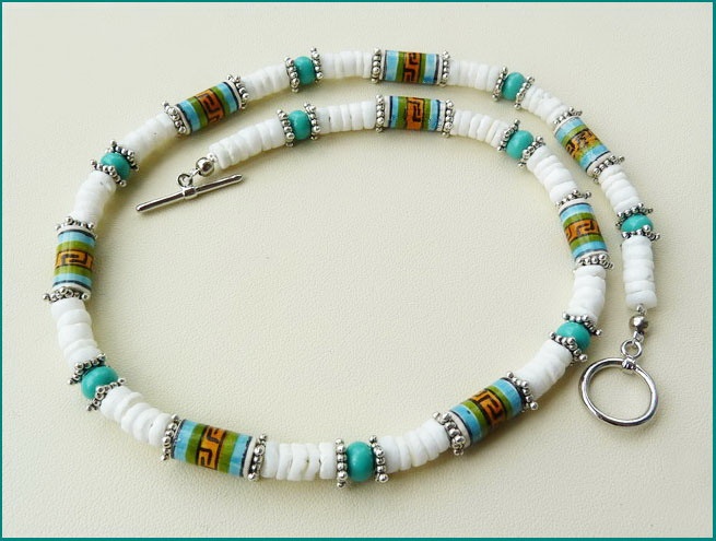 Керамика из Перу, стекло, чипсы ракушки, металлофурнитура. Длина 45 см (лежат по ключицам).