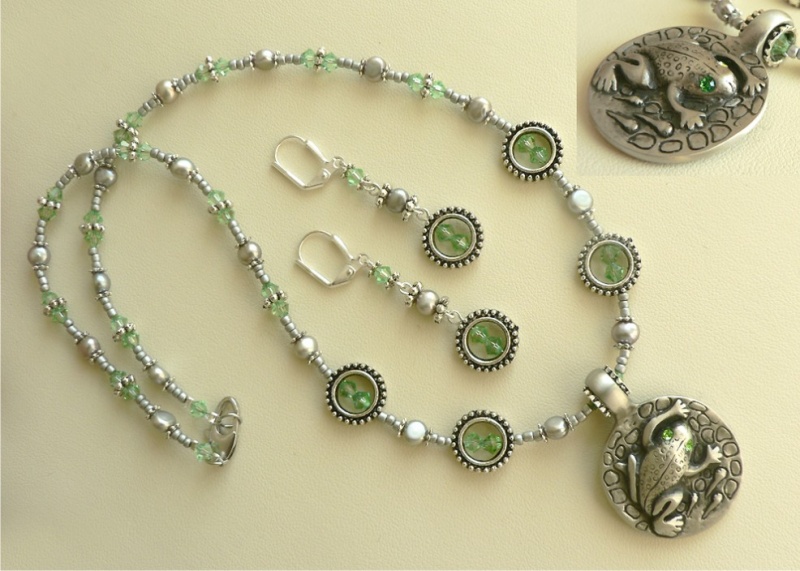 Кристаллы Сваровски, речной жемчуг и бисер цвета "металлик", металлофурнитура под черненое серебро, ювелирный тросик. Серьги на посеребренных швензах. Длина колье по шнуру -46 см. Размер подвески около 3 см. Лягушечка волшебная - листочек и тушка объемные, глазки сияют в окружении Сваровски. Посидит на листочке, посверкает глазом и ускачет по своим таинственным делам))))).