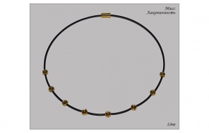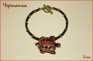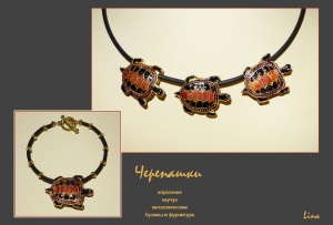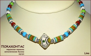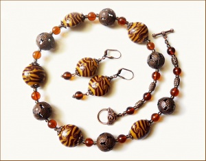 Лэмпворк (диаметр бусин 2 см), медные ажурные бусины (1,7 см), стекло, застежка-тоггл.