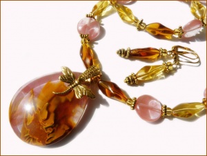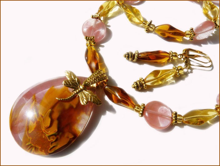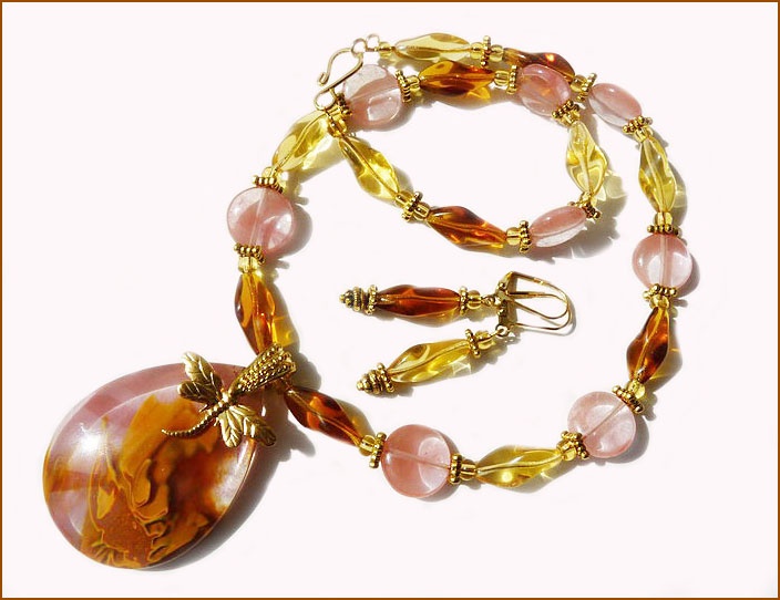 Кулон идеального качества из cherry-кварца с позолоченной подвеской-стрекозой, розовый кварц, чешское стекло. Длина до кулона 48 см (можно поставить удлиняющую цепочку), размер кулона 5х4 см.