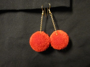 купленные в порыве любви к ярким аксессуарам, но так и неодетые сережки, эти помпончики (из синтетической наверное нитки) осенью буду просто чудесно смотреться - диаметр 3,5 см, длина цепочки на которой висит помпон - 5 см, цена 150 руб. цвет просто красный (на фото желтый оттенок)
