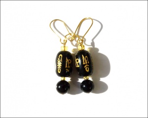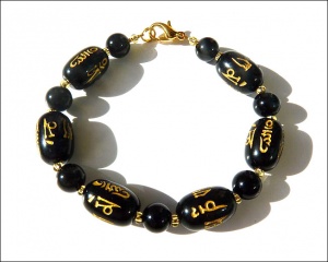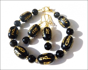 Обсидиановые бусины с золотистым дизайнерским орнаментом в стиле восточных алфавитов, круглый обсидиан c легким дымчатым отливом на некоторых бусинах.
