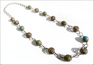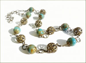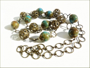 Крупные керамические и ажурные латунные бусины, фактурная цепь.