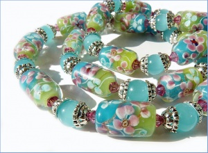 Лэмпворк с эффектом объемных цветов внутри стекла, кристаллы Сваровски цвета Rose, стекло.
