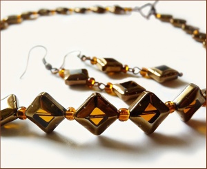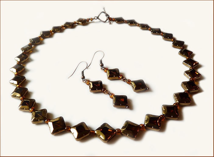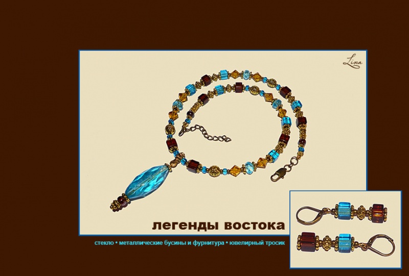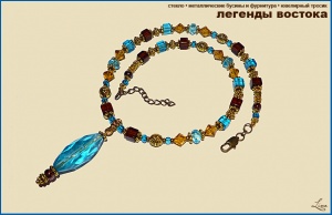 Стекло, бисер, медь. Прозрачные в центре бусины с омедненной окантовкой. Длина колье - 46 см, длина серег от швензы - 4 см.