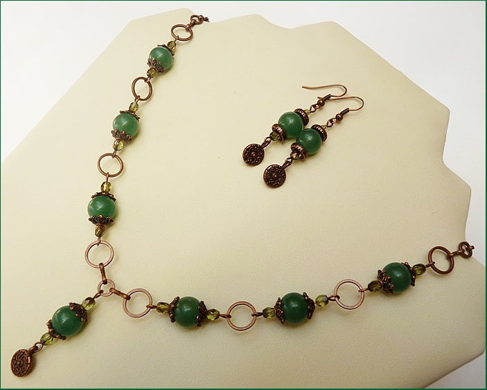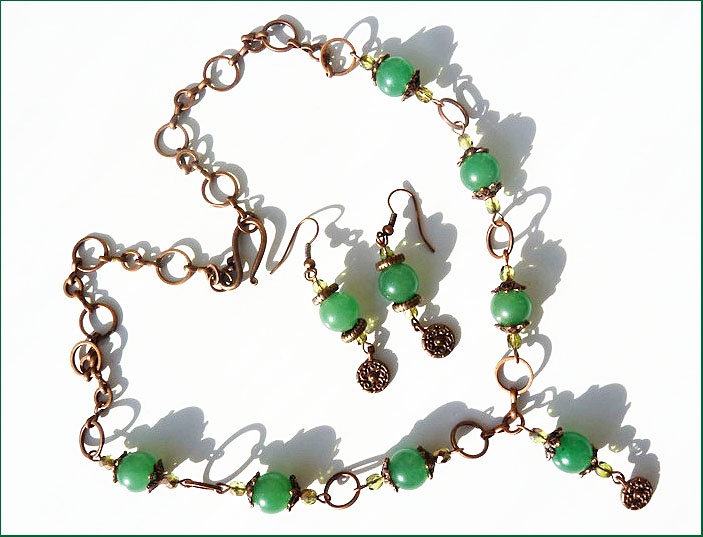 Нефрит, медь. Комплект выглядит сдержанно в пасмурный день и ярко - в солнечный:)