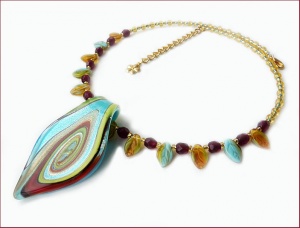 Кулон из стекла ручной работы (США), чешское стекло, мемори-основа для колье (держит форму, длина по окружности 44-45 см + позолоченная удлинительная цепочка). Размер кулона 6,5х3,5 см.