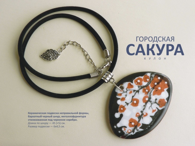 Кулон "Городская сакура". Керамическая глазурованная подвеска неправильной формы, черный бархатный шнур, металлофурнитура, стилизованная под черненое серебро. Длина по шнуру —45 (+5) см. Размер подвески — 6х4,5 см. 720 руб.