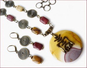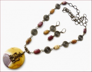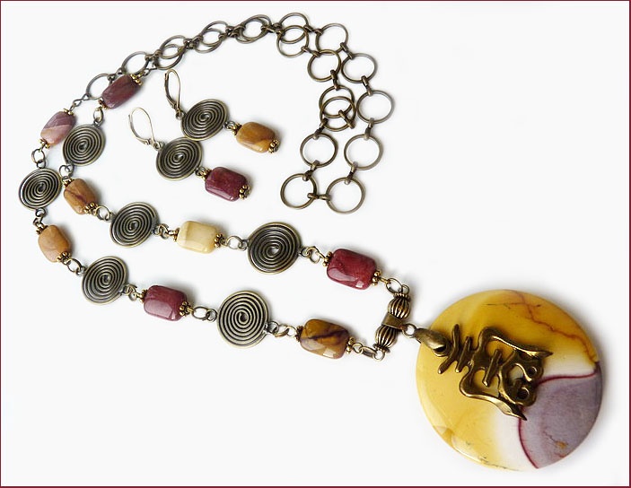 Кулон и бусины из яшмы Mookaite, латунная фурнитура и фурнитура TierraCast. Иероглиф - древнекитайский символ Чоу (пробуждает душевные силы и внутреннюю энергию, способствует хорошей работоспособности тела и разума, дает здоровье и силы всю жизнь, независимо от возраста. Напоминает о необходимости постоянного движения и развития на физическом и духовном планах. Поддерживает при интенсивной работе). Длина до кулона 70 см (при необходимости укорочу), диаметр кулона 4,5 см, длина серег от швензы 4 см (при желании можно заменить швензы на позолоченные).
