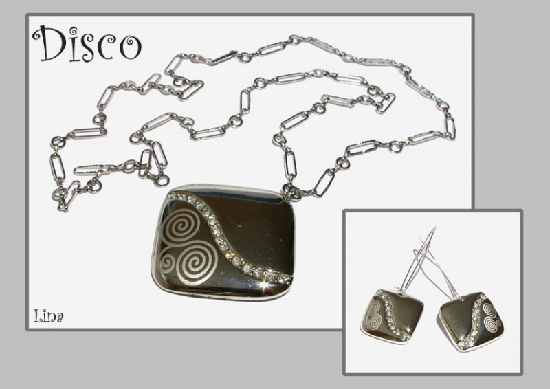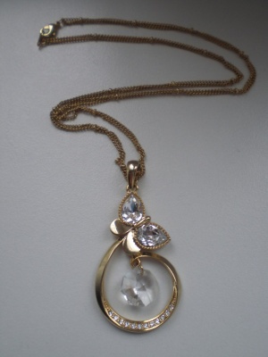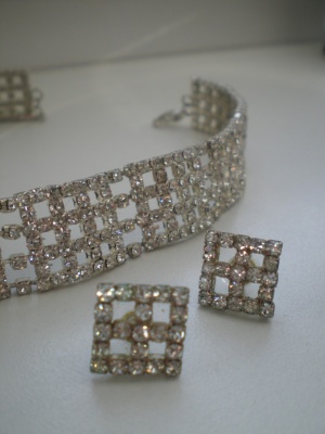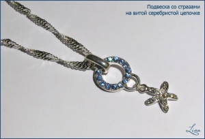 Подвеска со стразами на длинной (почти 80 см) цепочке и серьги на посеребренной основке. Размер подвески 4,5х4,5 см, размер подвесок на серьгах 1,7х1,7 см.