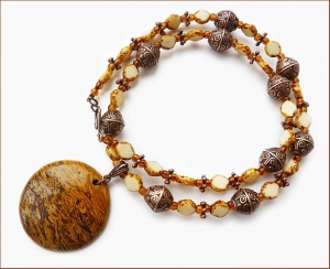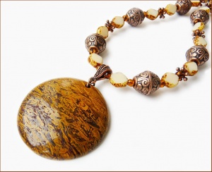 Кулон из разновидности яшмы под названием Elephant Skin (диаметр 3,8 см), чешское стекло, медь. Длина до кулона 55 см.