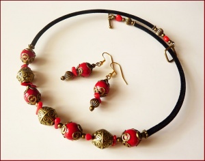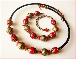 Кораллы двух видов, фурнитура латунь/бронза, бархатный шнур, мемори-основа для колье (длина окружности 42-43 см). Швензы серег - позолоченная медсталь. Браслет на минимальный обхват запястья 15-15,5 см плюс удлинительная цепочка.