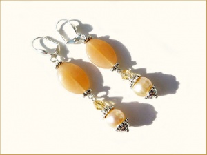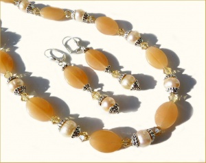 Стекло гладкое и граненое, натуральный жемчуг (диаметр 8-9 мм). Дина бус 48 см, длина серег от швензы 5 см (швензы посеребренные).