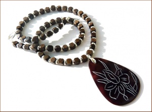 Кулон из перламутровой пластины с вырезанным изображением цветка (5,5х3,5 см), бамбуковые бусины, посеребренные бусины.